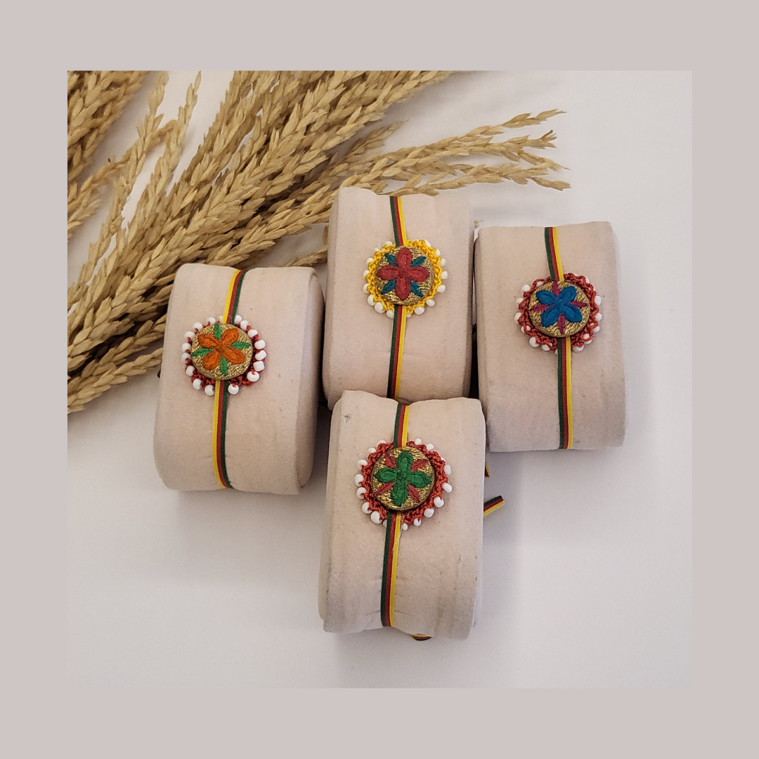 This Rakhi is a masterpiece of craftsmanship, featuring a delicate golden thread intricately woven to form a floral motif. Adorned with shimmering golden beads and embellishments, this Rakhi exudes grace and sophistication, making it a timeless symbol of love.