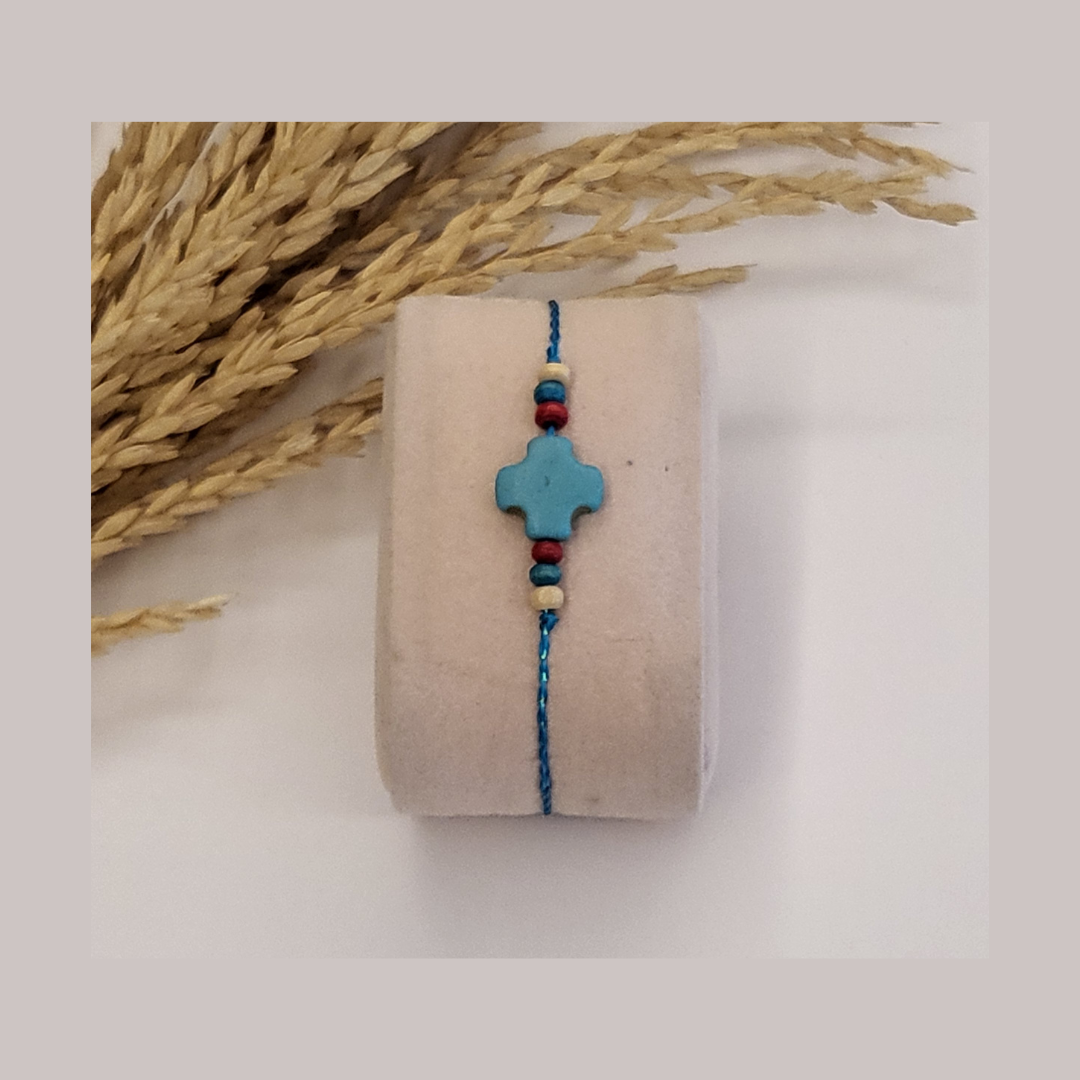 This Rakhi is a masterpiece of craftsmanship, featuring a delicate golden thread intricately woven to form a floral motif. Adorned with shimmering golden beads and embellishments, this Rakhi exudes grace and sophistication, making it a timeless symbol of love.