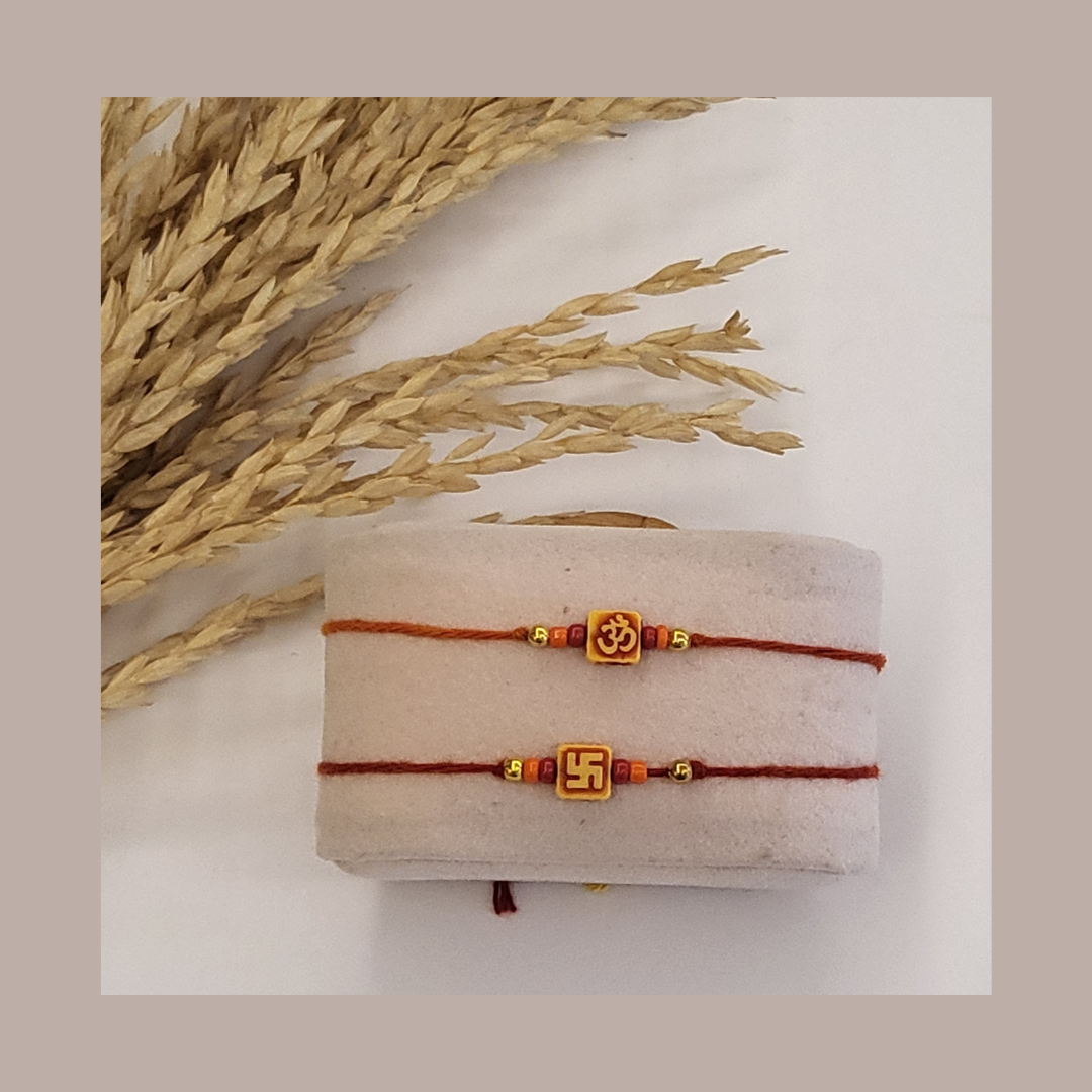 This Rakhi is a masterpiece of craftsmanship, featuring a delicate golden thread intricately woven to form a floral motif. Adorned with shimmering golden beads and embellishments, this Rakhi exudes grace and sophistication, making it a timeless symbol of love. Set of 2