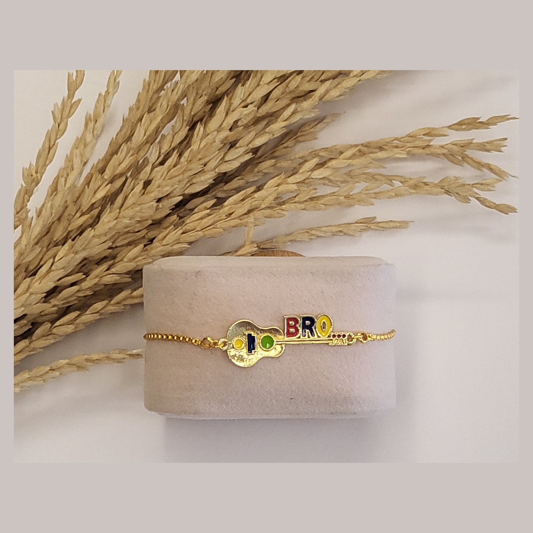 This Rakhi is a masterpiece of craftsmanship, featuring a delicate golden thread intricately woven to form a floral motif. Adorned with shimmering golden beads and embellishments, this Rakhi exudes grace and sophistication, making it a timeless symbol of love.