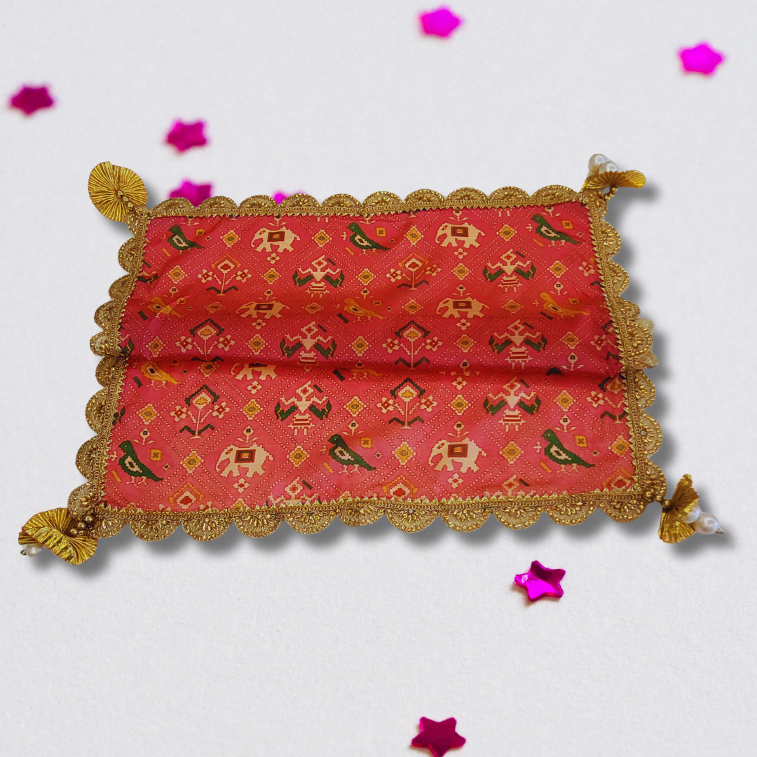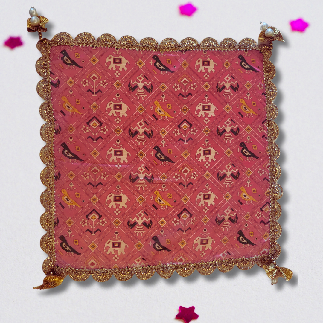 Add a touch of sophistication to your ceremonial setup with our exquisite thaal covers, boasting intricate Patan prints, elegant borders, and luxurious tassels, sure to impress your guests.