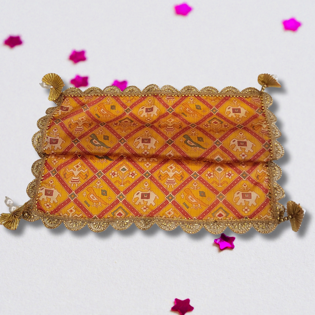 Add a touch of sophistication to your ceremonial setup with our exquisite thaal covers, boasting intricate Patan prints, elegant borders, and luxurious tassels, sure to impress your guests.